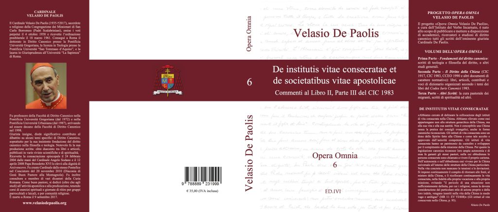 Il volume 6 delle Opere Complete del Cardinale Velasio De Paolis è uno dei tre volumi che raccolgono gli scritti dell’autore sul diritto della vita consacrata.